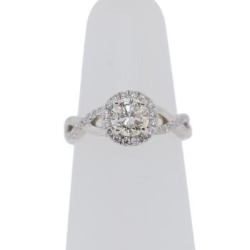 Estate 2-23: Platinum 4.6g Round cut Diamond halo engagement ring with crossover sides .63ct Round cut center Diamond, I color and VS1 clarity. 33 ctw side diamonds