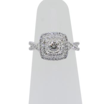 Estate 4-23: 14k white gold 2.6g Diamond engagement ring, double halo and crossover shank .15ct center round and .30ctw side diamonds